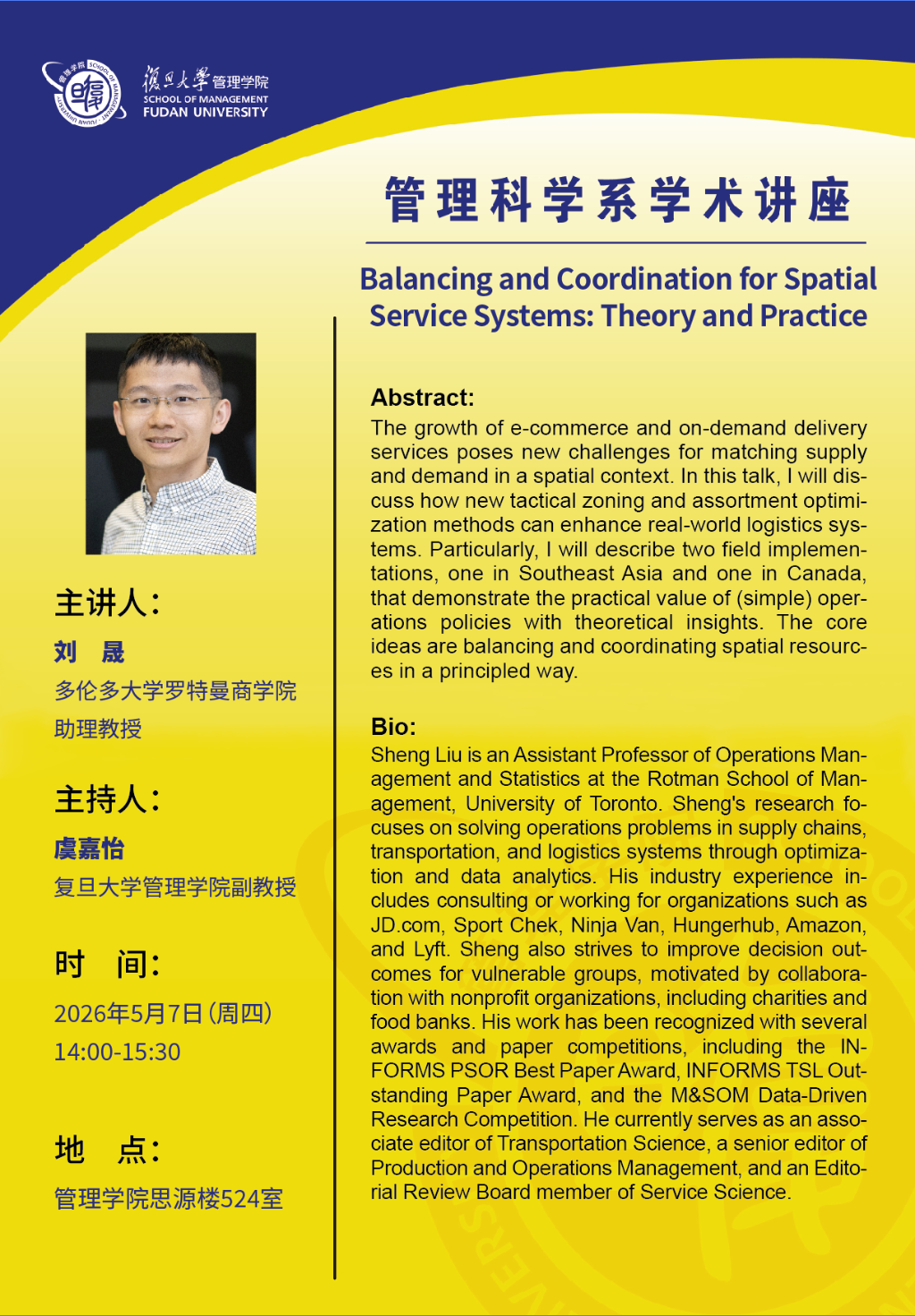 Bio:Sheng Liu is an Assistant Professor of Operations Management and Statistics at the Rotman School of Management, University of Toronto. Sheng's research focuses on solving operations problems in supply chains, transportation, and logistics systems through optimization and data analytics. His industry experience includes consulting or working for organizations such as JD.com, Sport Chek, Ninja Van, Hungerhub, Amazon, and Lyft. Sheng also strives to improve decision outcomes for vulnerable groups, motivated by collaboration with nonprofit organizations, including charities and food banks. His work has been recognized with several awards and paper competitions, including the INFORMS PSOR Best Paper Award, INFORMS TSL Outstanding Paper Award, and the M&SOM Data-Driven Research Competition. He currently serves as an associate editor of Transportation Science, a senior editor of Production and Operations Management, and an Editorial Review Board member of Service Science.